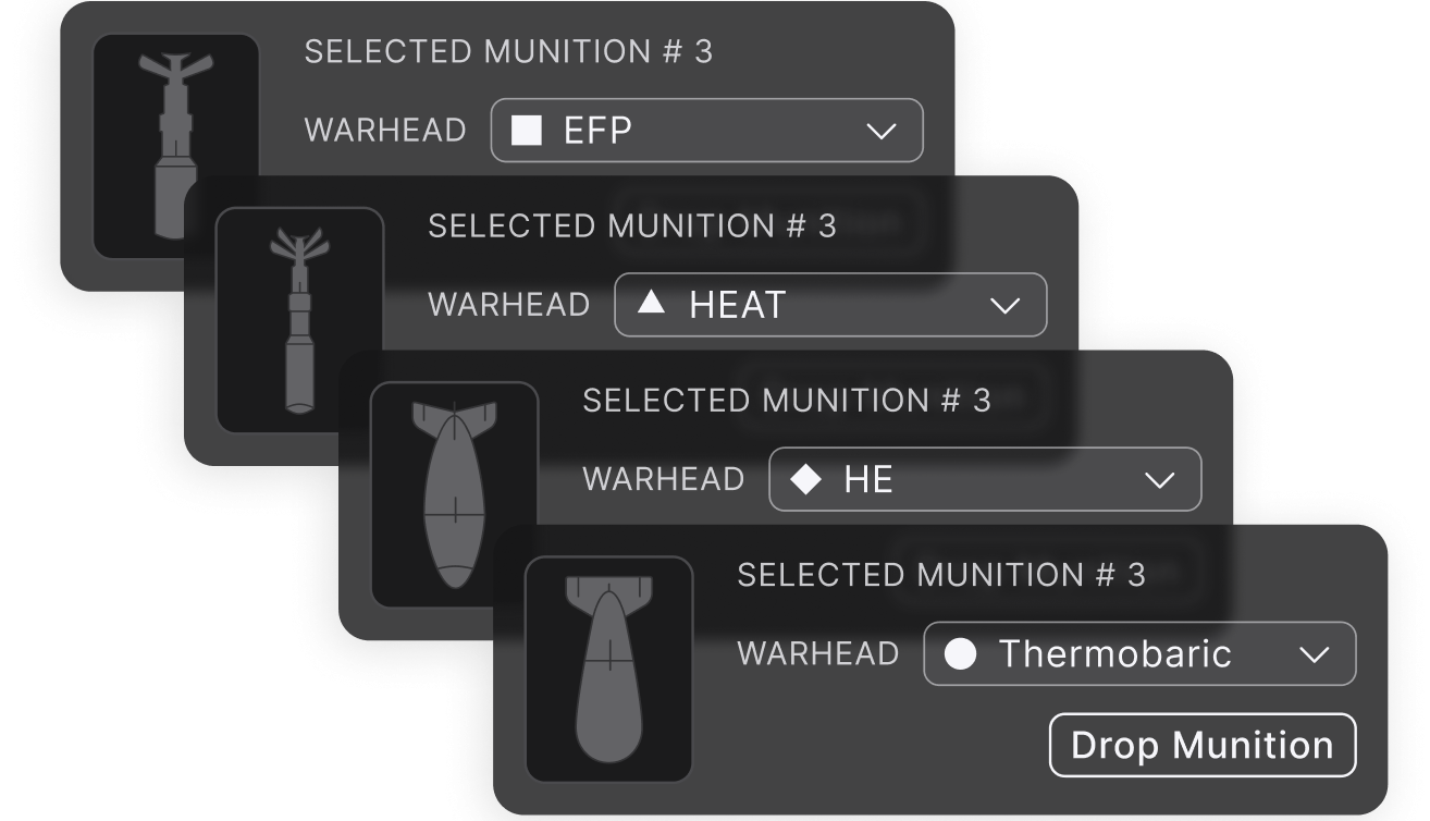 VITRYNA дозволяє управляти типами апаратів і боєприпасів, контролювати їх готовність і відображати потрібні показники. Інтерфейс адаптується під завдання підрозділу, зберігаючи простоту та гнучкість навіть у складних умовах.